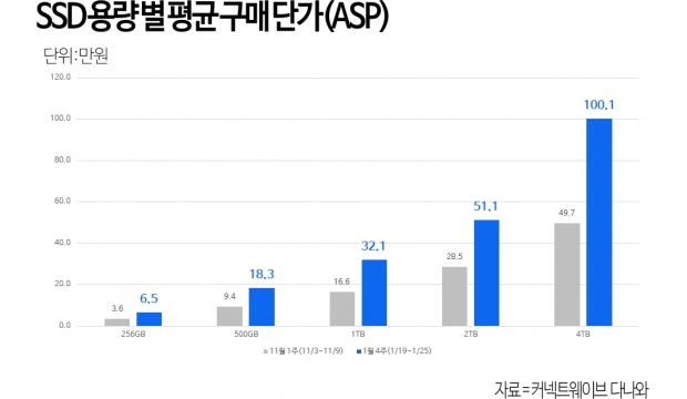 - SSD 4TB 제품군 1월 4주차 평균 구매가 100.1만 원 기록... 11월 대비 상승폭 확대 - 1TB 및 2TB 모델 등 메인스트림 구간에서도 전반적인 가격 상향 평준화 나타나 - 낸드플래시 생산 정책 및 AI 인프라 수요 변화에 따른 수급 불균형이 주요 원인 이커머스 전문기업 커넥트웨이브가 운영하는 가격비교 서비스 다나와는 최근 주요 저장장치(SSD·HDD)의 용량별 가격 추이를 분석한 결과, SSD와 HDD 전 구간에서 평균 구매가가 상승 곡선을 그리고 있다고 30일 밝혔다. 다나와에 따르면, SSD 시장은 전 용량 구간에서 가격이 상승하고 있다. 특히 고용량인 4TB SSD의 1월 4주차(1/19~1/25) 평균 구매가는 100.1만 원으로 지난해 11월 1주차(11/3~11/9, 49.7만 원) 대비 2배 이상 급등했다. 또 수요가 가장 많은 1TB SSD의 평균 구매가는 11월 1주차 16.6만 원에서 1월 4주차 32.1만 원으로 올랐으며, 2TB SSD 역시 같은 기간 28.5만 원에서 51.1만 원으로 상승했다. 500GB SSD와 256GB SSD 또한 각각 18.3만 원과 6.5만 원을 기록하며 11월 대비 오름세를 유지했다. HDD 시장에서도 고용량 제품을 중심으로 가격 강세가 관찰됐다. 24TB HDD의 1월 4주차 평균 구매가는 99만 원을 기록하며 상승세를 이어갔고, 16TB 제품은 80.1만 원으로 지난해 11월 1주차(51.3만 원) 대비 대폭 올랐다. 2TB HDD 역시 11만 원대에서 17만 원대까지 뛴 것으로 분석됐다. 이 같은 저장장치 가격의 전반적인 변화는 글로벌 반도체 제조사의 낸드플래시 감산 기조와 더불어, AI 데이터센터 구축을 위한 엔터프라이즈 수요 증가가 소비자용 제품 수급에 영향을 준 것으로 풀이된다. 다나와 관계자는 “최근 저장장치 시장은 특정 제품에 국한되지 않고 전 용량 구간에서 평균 구매가가 상향 평준화된 상태”라며 “공급 상황에 따른 변동성이 당분간 유지될 것으로 예상되는 만큼, 소비자들은 가격 추이 정보를 상시 확인하여 구매 계획을 세울 필요가 있다”고 말했다. |