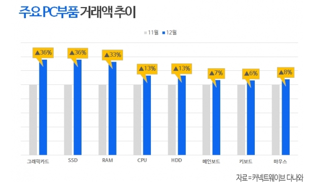 - 12월 PC 부품 거래액 전월 대비 23% 상승 - SSD(▲36%), RAM(▲33%), 그래픽카드(▲36%) 등 핵심 부품 거래액 가파른 상승세 - 고가격에 소비자 부담은 증가…다나와, 가격 부담 낮춘 ‘가성비 브랜드 기획전’ 마련 이커머스 전문기업 커넥트웨이브가 운영하는 가격비교 서비스 ‘다나와’는 최근 D램 가격 상승으로 인한 PC 부품 시장의 가격 변동성과 거래 현황을 분석한 결과, 12월 PC 부품 거래액이 전월 대비 크게 상승했다고 5일 밝혔다. 다나와 데이터에 따르면, 12월 PC 부품 거래액은 전월 대비(MoM) 23% 상승했다. 특히 메모리 반도체 가격 상승의 직접적인 영향권에 있는 SSD와 RAM의 거래액은 각각 전월 대비 약 36%와 33%의 높은 상승률을 기록했다. 가격 단가가 높은 그래픽카드 역시 약 36%의 상승폭을 보이며 전체 시장의 거래액 상승을 견인했다. 이 같은 거래액 급증은 D램 가격 상승에 따른 부품 가격의 추가 인상 전 구매를 서두르는 매수세가 유입됐기 때문으로 분석된다. 실제로 판매 수량보다 거래액의 상승폭이 더 크게 나타나며 소비자들이 느끼는 가격 체감률은 더욱 높아진 상태다. 가격 상승 여파가 PC 시장 전반으로 확산됨에 따라, 다나와는 소비자들의 예산 부담을 덜어줄 ‘체감 성능은 그대로, 가격은 더 낮게’ PC 부품 기획전을 긴급 편성했다. 이번 기획전은 브랜드 비용을 최소화하고 성능에 집중한 글로벌 가성비 부품들을 큐레이션하여 제공한다. 기획전에서는 최근 시장에서 검증된 성능과 합리적인 가격으로 돌풍을 일으키고 있는 PC 부품과 게이밍기어 등 글로벌 가성비 브랜드의 부품을 주력으로 소개한다. 특히 SSD와 RAM의 가격 상승이 부담스러운 소비자들을 위해 해당 브랜드의 고성능 저장장치와 메모리를 최신 라이젠 프로세서 및 RTX 50 시리즈 그래픽카드와 조합한 최적의 가성비 견적을 제안한다. 다나와 관계자는 “D램 등 핵심 소재의 가격 상승으로 조립 PC 시장의 가격 변동성이 그 어느 때보다 큰 상황”이라며, “소비자들의 부담이 가중되고 있는 만큼, 다나와는 신뢰할 수 있는 가성비 브랜드를 지속적으로 발굴해 합리적인 소비 가이드를 제시할 것”이라고 밝혔다. 한편, 이번 기획전에 포함된 상세 부품 정보와 용도별 가성비 조립 PC 견적은 다나와 기획전 페이지를 통해 확인할 수 있다. |