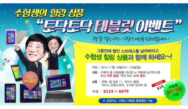 - 해외직구가 보다 최대 44% 저렴- 수험표 인증하면 $10 추가 쿠폰 제공 국내 최대 해외 배송대행 업체 몰테일에서 운영하는 간편 해외직구 마켓 ‘테일리스트(www.tailist.com/대표 김기록)’가 오는 19일부터 23일까지 수험생을 위한 ‘토닥토닥 태블릿PC 기획전’을 연다. 이번 기획전은 넥서스, 델, 마이크로소프트 등 수험생 선물로 인기 높은 신제품 및 리퍼 태블릿 PC 5종을 해외직구보다 최대 44% 저렴한 가격에 선보인다. 특히, ‘트렌스포머북’으로 불리는 ‘Asus T100 64GB’ 모델은 국내 최저가보다 약 40% 저렴한 20만원대로, 가격대비 높은 성능을 자랑하는 ‘델 베뉴 프로 11 i-5 128GB’는 약 40만원 대에 구입이 가능하다. 또한, 2015년 수능 수험표를 인증하는 수험생에겐 $10 할인 쿠폰 등 추가 혜택도 제공한다. 테일리스트 최동환 팀장은 “올 한해 수능 준비로 고생한 수험생들을 격려하기 위해 이번 기획전을 마련했다”며 “이번 기획전은 ‘수험생 위시리스트’로 인기 높은 태블릿 PC를 국내뿐 아니라 해외 직구가보다 저렴하게 구입할 수 있는 좋은 기회다”라고 말했다. 한편, 테일리스트는 미국∙일본∙중국∙독일의 현지 MD가 선정한 인기제품을 해외판매가로 구입할 수 있는 사이트로 직구 초보자도 쉽고 편리하게 구매할 수 있는 것이 특징이다. |